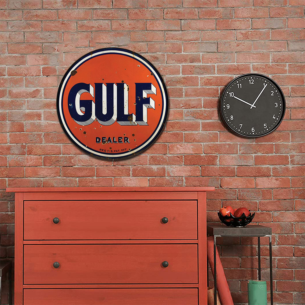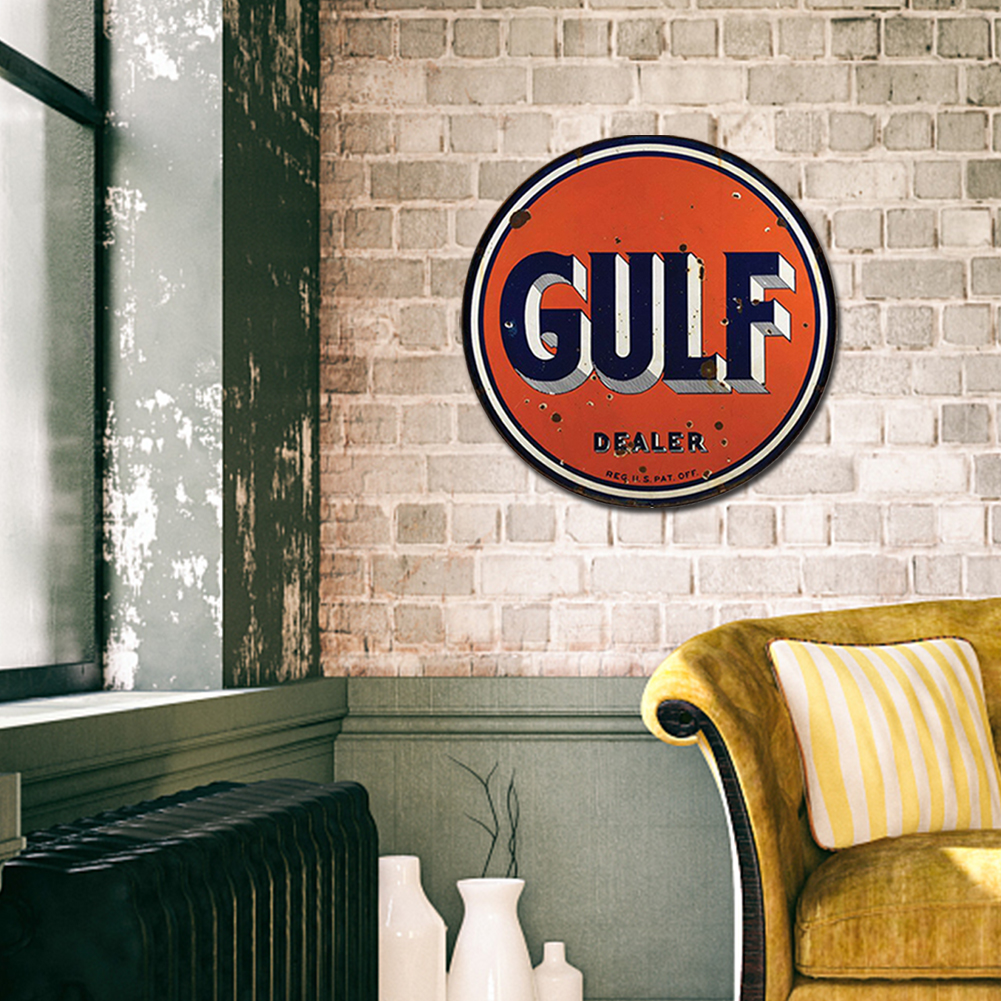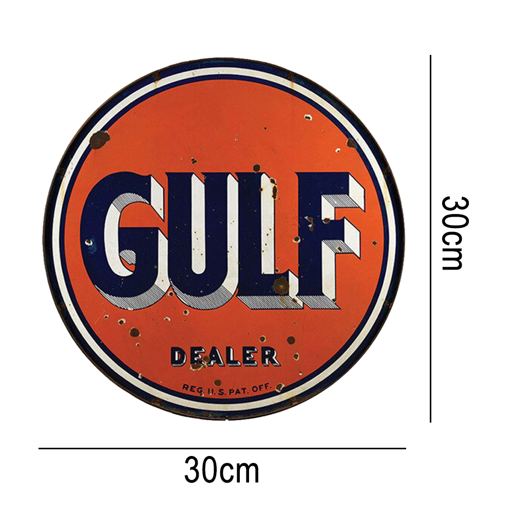 30x30cm GULF Letter Pattern Tin Painting Vintage Metal Round Wall Signs Decor Plaque Art Retro Tin Plate Paintings for Bar Cafe Garage