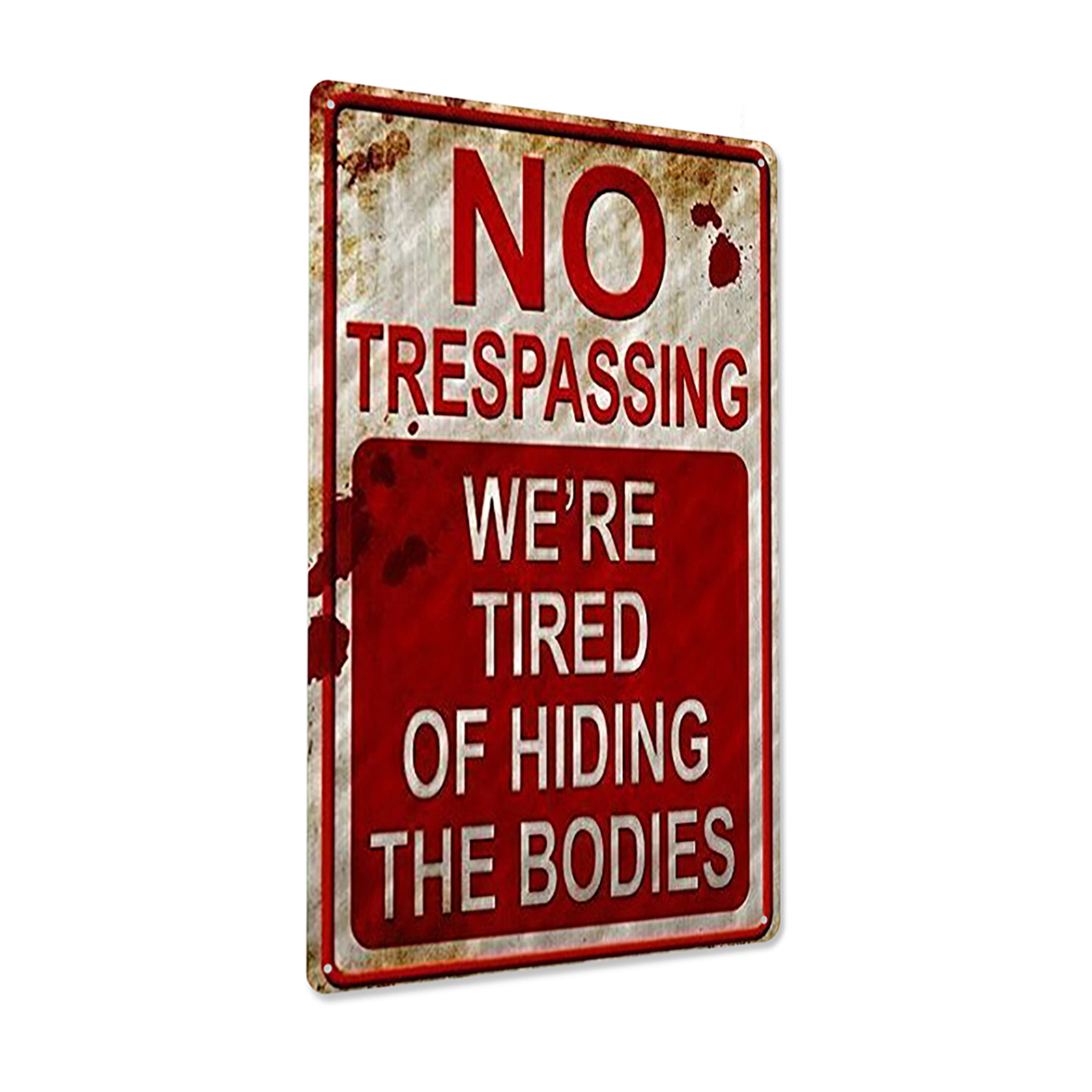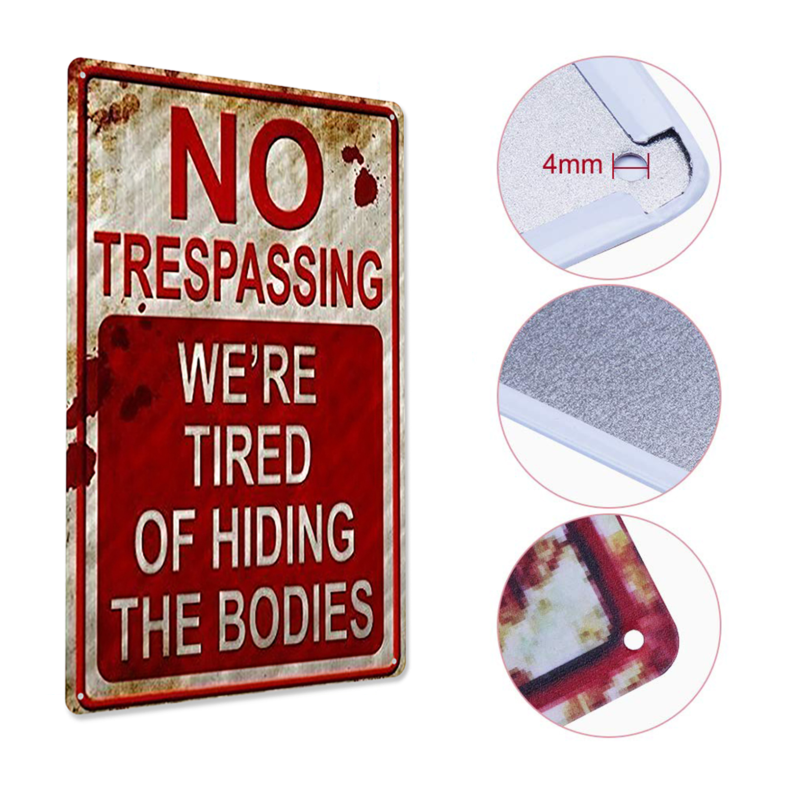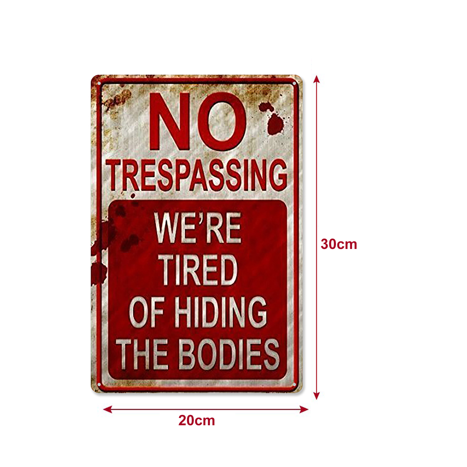 Retro Chic Funny Metal Sign - Rust Free UV Protected & Weatherproof, Halloween Prank Sign, Vintage Bar Decor Yard Signs, No Trespassing We're Tired of Hiding The Bodies Warning Tin SignFeature:The installation method can be door frame or wall hanging.Waterproof and glare-free.Four pre-drilled holes are convenient for hanging, and they are convenient for installation on walls, doors, gates or fences. (Please note that it does not include screws. )This novel, trespassing poster is very suitable for any family or other institution in America.This is the best choice for Halloween sign, creepy home decoration, Halloween sign, Halloween decoration and no intrusion.Fashionable, chic and interesting metallic tin logo is forbidden to intrude.Specification:Material: tinplate/metalSize: 20*30cm/7.9*11.8inch;30*40cm/11.8*15.7inchStyle: American retroApplicable scenes: home, bar, coffee shop, KTV, etc.Note:Due to the different monitor and light effect, the actual color of the item might be slightly different from the color showed on the pictures. Thank you!Please allow 1-2cm measuring deviation due to manual measurement.