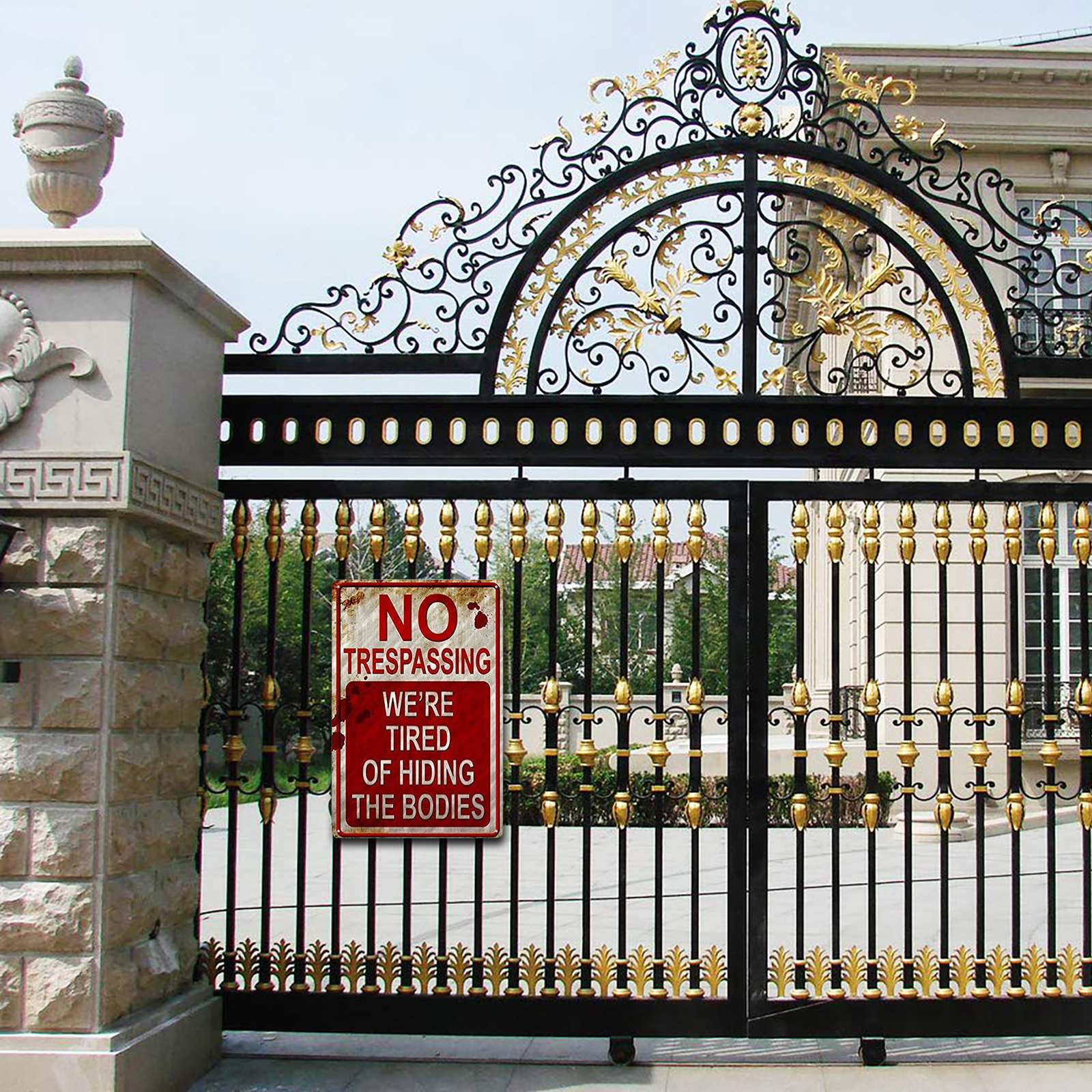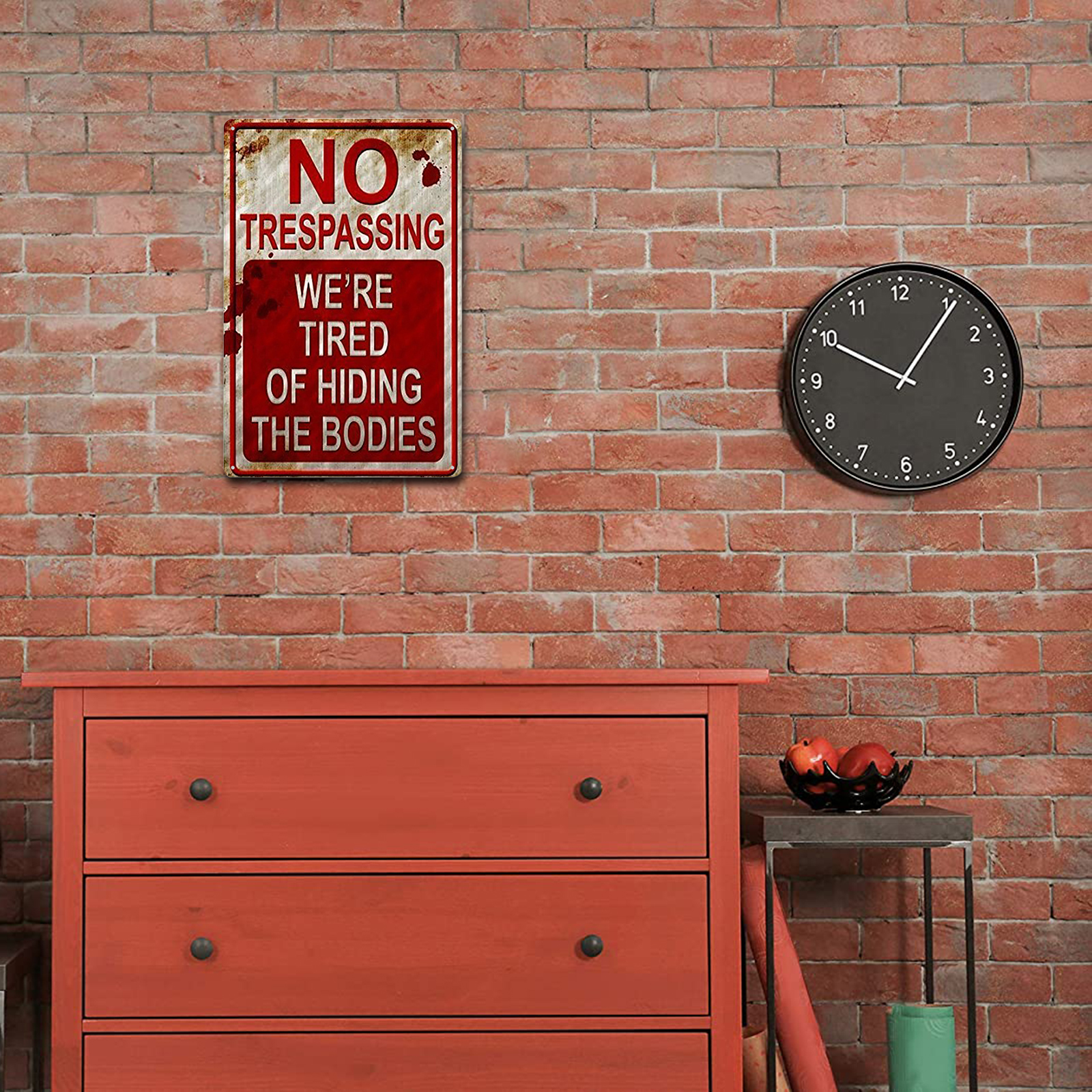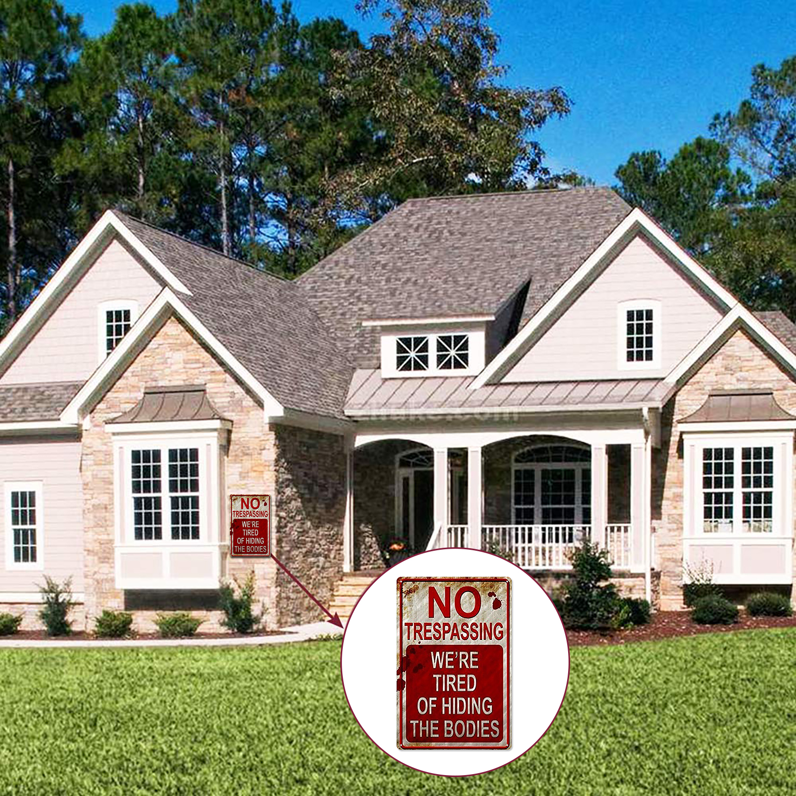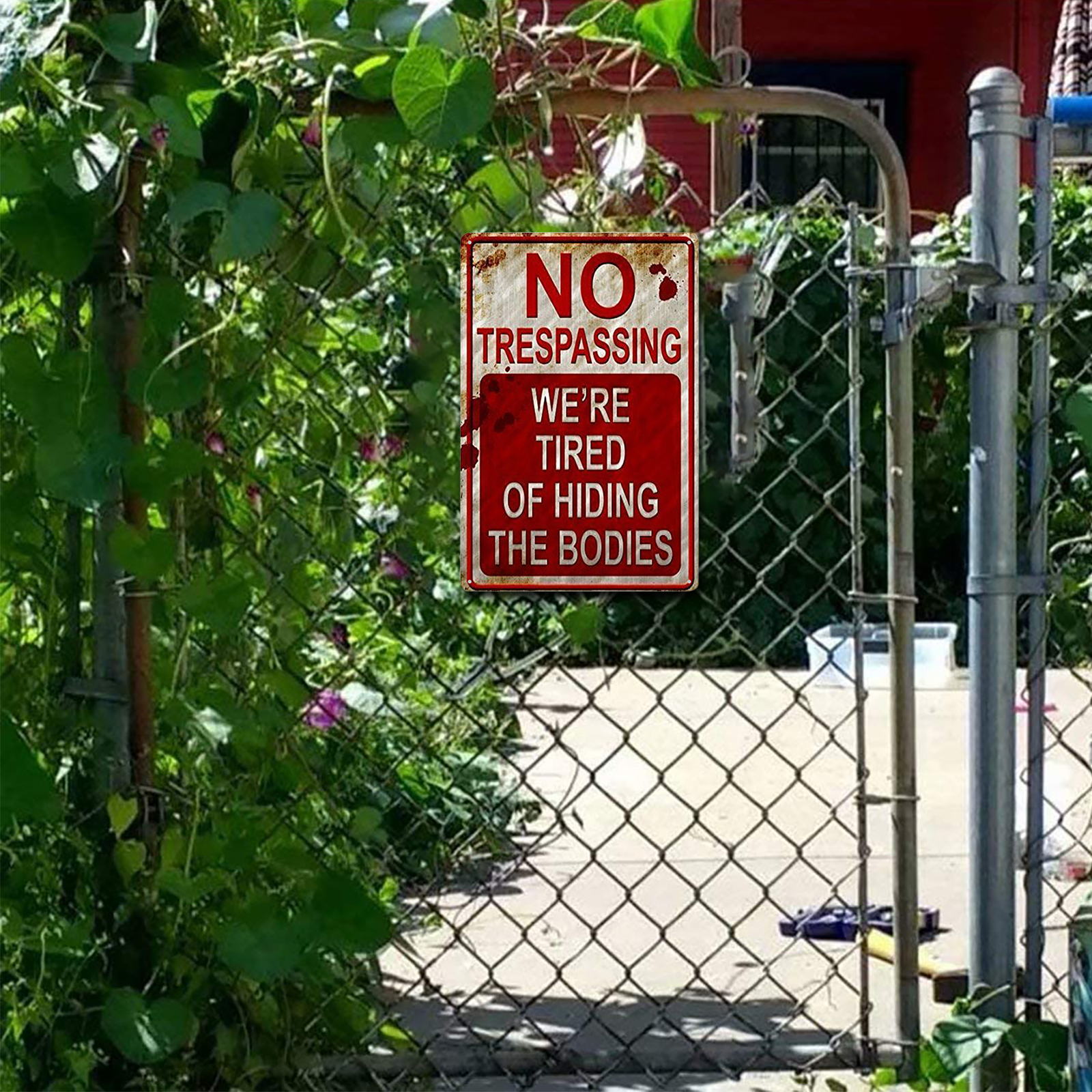 Retro Chic Funny Metal Sign - Rust Free UV Protected & Weatherproof, Halloween Prank Sign, Vintage Bar Decor Yard Signs, No Trespassing We're Tired of Hiding The Bodies Warning Tin SignFeature:The installation method can be door frame or wall hanging.Waterproof and glare-free.Four pre-drilled holes are convenient for hanging, and they are convenient for installation on walls, doors, gates or fences. (Please note that it does not include screws. )This novel, trespassing poster is very suitable for any family or other institution in America.This is the best choice for Halloween sign, creepy home decoration, Halloween sign, Halloween decoration and no intrusion.Fashionable, chic and interesting metallic tin logo is forbidden to intrude.Specification:Material: tinplate/metalSize: 20*30cm/7.9*11.8inch;30*40cm/11.8*15.7inchStyle: American retroApplicable scenes: home, bar, coffee shop, KTV, etc.Note:Due to the different monitor and light effect, the actual color of the item might be slightly different from the color showed on the pictures. Thank you!Please allow 1-2cm measuring deviation due to manual measurement.